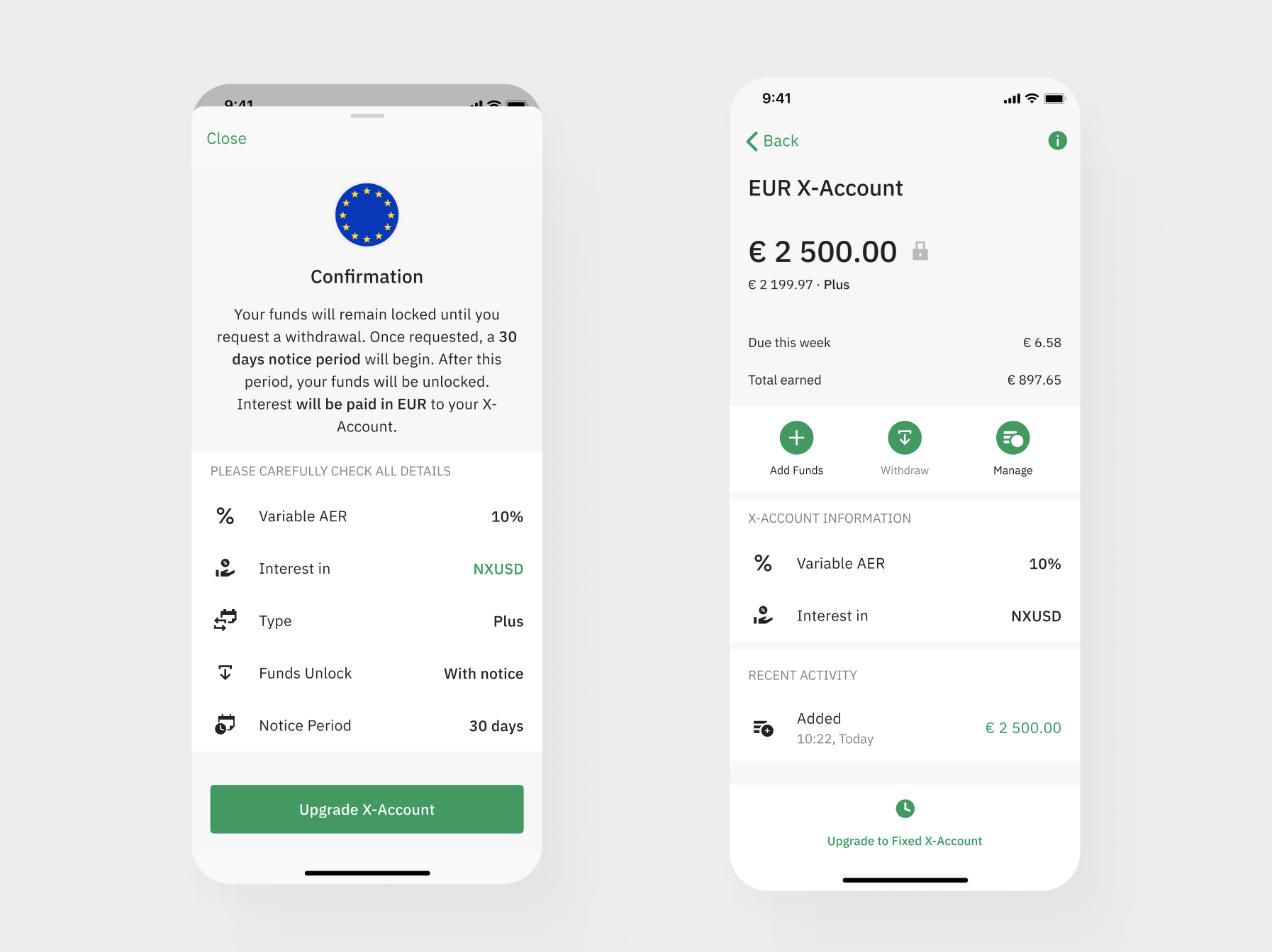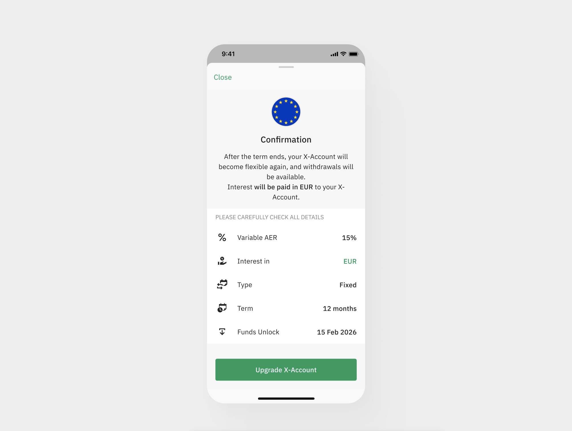 Review the details of your selected term, interest rate, and payment currency. Then tap ‘Upgrade X-Account’ to confirm.